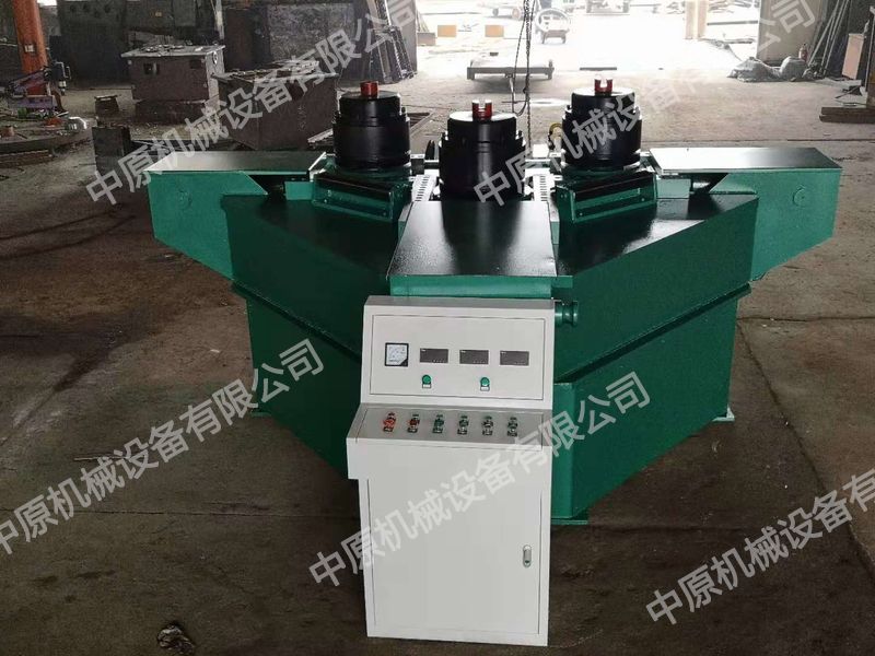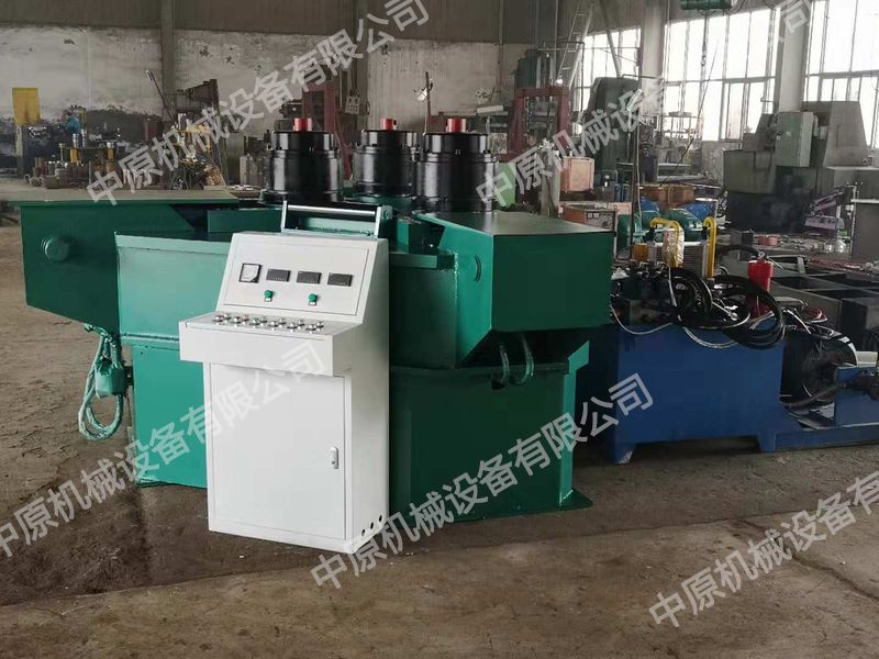 該機(jī)為叁輥型材卷圓機(jī),集機(jī)電一體。電機(jī)輸出的較高轉(zhuǎn)速通過(guò)傳動(dòng)裝置(聯(lián)軸器,液壓馬達(dá),液壓油缸,齒輪等)轉(zhuǎn)換成所需的大扭矩低轉(zhuǎn)速,帶動(dòng)兩主動(dòng)輥實(shí)現(xiàn)旋轉(zhuǎn)運(yùn)動(dòng),為型材行走提供扭矩。兩個(gè)主動(dòng)輥中心距可調(diào),被動(dòng)輥通過(guò)液壓油缸前進(jìn)、后退實(shí)現(xiàn)位移,來(lái)控制直徑大小。三個(gè)工作輥成等腰三角形分布,通過(guò)調(diào)整移動(dòng)輥實(shí)現(xiàn)這三個(gè)點(diǎn)形成的弧線達(dá)到所需彎曲半徑,借助被動(dòng)輥的壓緊及兩主動(dòng)輥的旋轉(zhuǎn)運(yùn)動(dòng),使型材經(jīng)過(guò)多次連續(xù)彎曲,產(chǎn)生永久性塑性變形,用于常溫狀態(tài)下將型材卷制成圓形,弧形等工件。